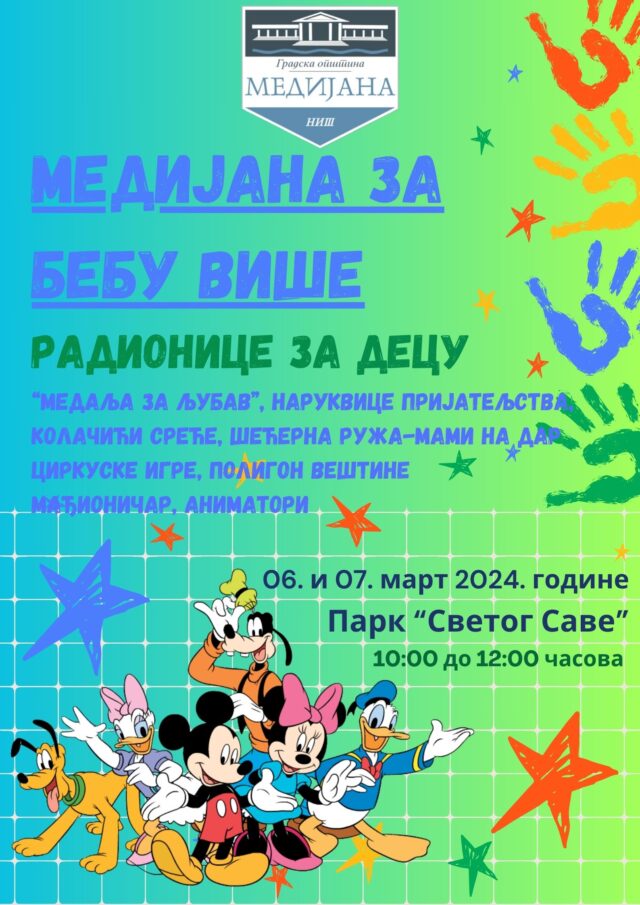 Gradska opština Medijana, u sredu i četvrtak, 06. i 07.marta 2024.godine, od 10 do 12 sati, organizuje tradicionalnu manifestaciju „Medijana za bebu više“, namenjenu najmlađima.