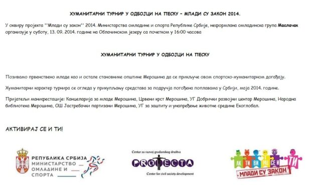 U subotu, 13. 09. 2014. godine od 16:00 časova na Oblačinskom jezeru organizuje se Humanitarni turnir u odbojci na pesku u okviru projekta MLADI SU ZAKON 2014. godine koji se realizuje uz pomoć Ministarstva omladine i sporta Republike Srbije i resurs centra za Nišavski okrug Protecta.