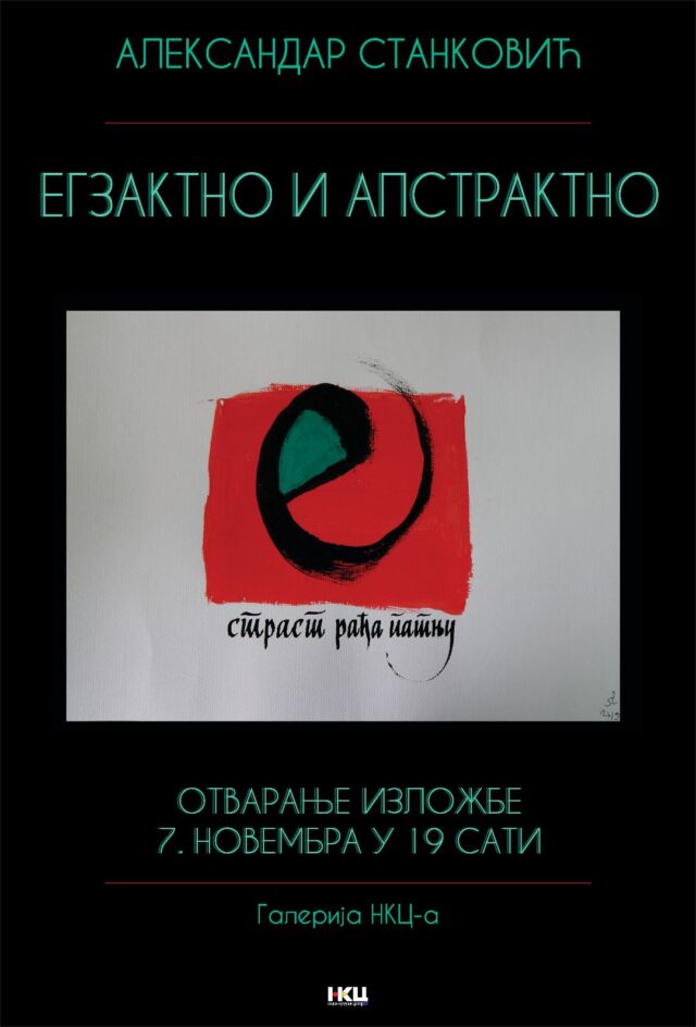 Otvaranje izložbe kaligrafija „Egzaktno i apstraktno” Aleksandra Stankovića zakazana je za četvrtak 7. novembra 2019, u Galeriji Niškog kulturnog centra, sa početkom u 19 časova.