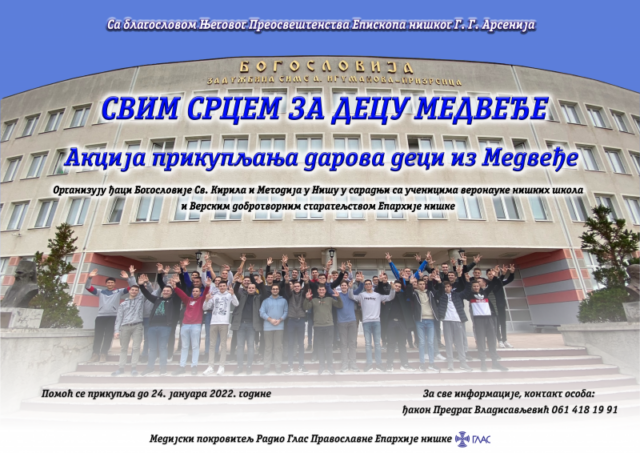 Đaci Bogoslovije „Svetih Kirila i Metodija“ u Nišu u saradnji sa učenicima veronauke niških škola i Verskim dobrotvornim starateljstvom Eparhije niške organizuju akciju prikupljanja pomoći deci iz Medveđe.