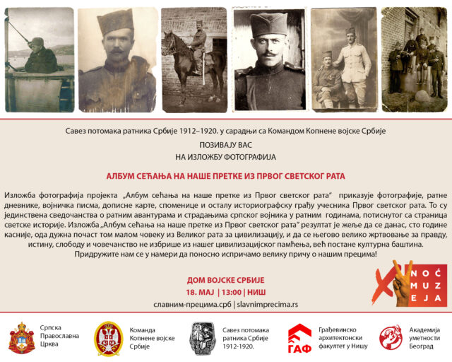 U sklopu obeležavanja stogodišnjice od Prvog svetskog rata, u Domu Vojske Srbije u Nišu 18. maja 2018. godine, sa početkom u 13 časova, biće otvorena izložba „ Album sećanja na naše pretke iz Prvog svetskog rata“ – izložba slavnim precima u čast!