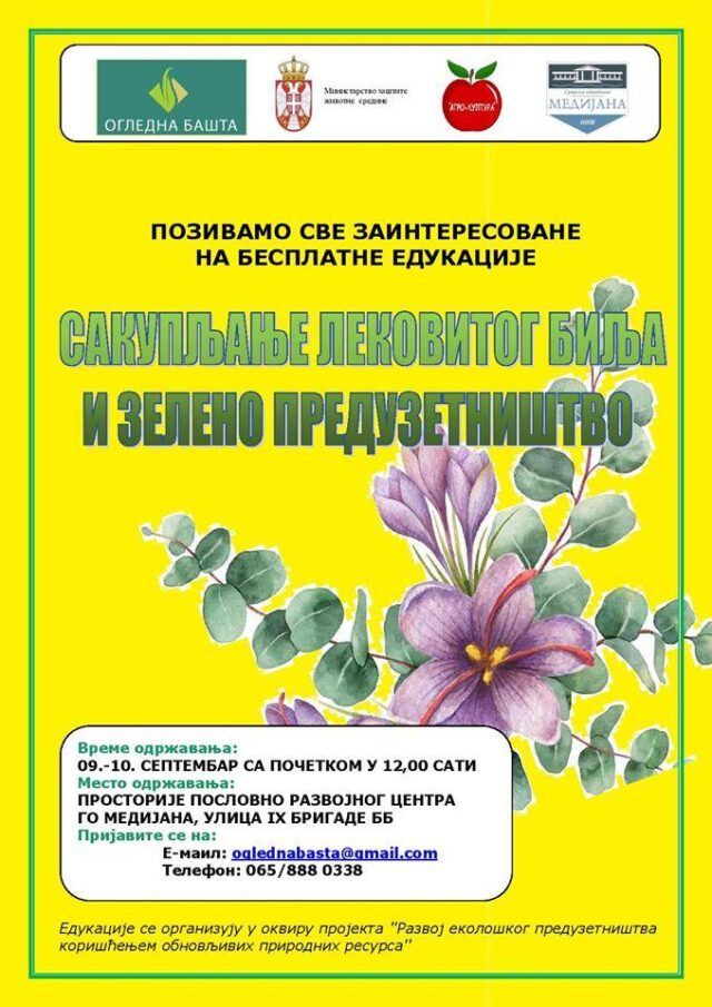 Udruženje „Ogledna bašta“ organizovaće u ponedeljak i utorak, 9. i 10. septembra besplatnu edukaciju za sakupljanje lekovitog bilja i edukaciju o zelenom preduzetništvu za sve građane i organizacije civilnog društva.