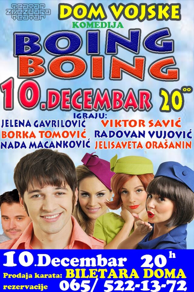 U Subotu 10. decembra sa početkom u 20 sati odigrati urnabesna komedija Zvezdara teatra BOING – BOING. BOING BOING Marka Kamoletija je hit komedija 60-ih. Prve predstave u Londonu i Parizu igrale su se dvadeset godina.