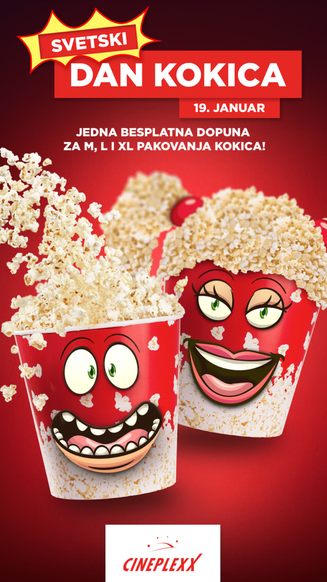 Cineplexx Niš bioskop i ove godine obeležava Svetski dan kokica. U četvrtak, 19. januara uz kupljene M, L i XL kokice dobijate jednu besplatnu dopunu.