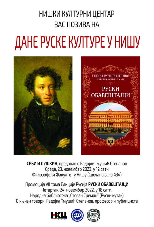 U Sredu, 23. novembara 2022, u 12 sati na Filozofskom Fakultetu u Nišu (Svečana sala 434), biće održano predavanje Radojke Tmušić Stepanov – SRBI I PUŠKIN.
