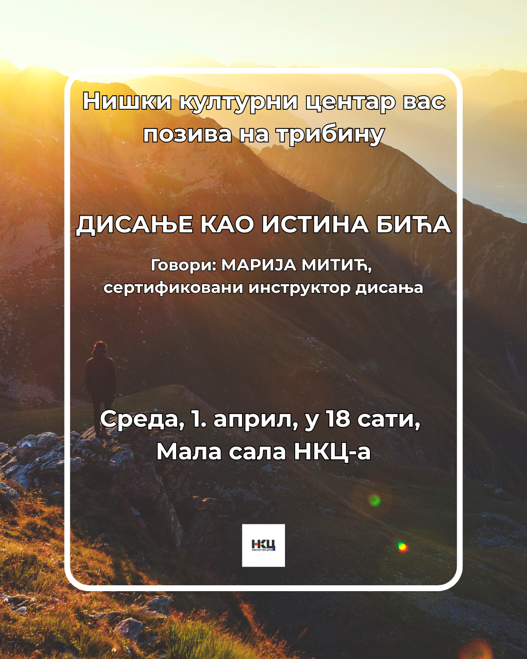 Tribina pod nazivom „Disanje kao istina bića“, biće održana u sredu, 1. aprila, od 18 sati u Maloj sali NKC-a. O ovoj temi govoriće Marija Mitić, sertifikovani instruktor disanja, koja kroz svoj rad istražuje vezu između daha, tela i unutrašnjih procesa.