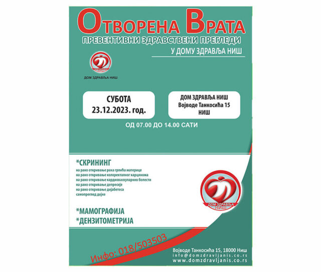 Sutra od 7 do 14 časova u centralnom objektu Doma zdravlja biće organizovana akcija preventivnih i skrining pregleda. Akcija je namenjena svim zainteresovanim građanima koji žele da ulože u svoje zdravlje i time preveniraju mnoge bolesti.