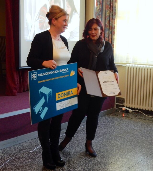 I predsednik Gradske organizacije gluvih i nagluvih Zvonimir Stojanović zahvalio je na ovoj donaciji. „Dodela računara, po rečima Zorice Džide menadžerke za društveno odgovorno poslovanje Vojvođanske banke, je deo donatorske akcije Vojvođanske banke, koja je pokrenuta kako bi se podržala zajednica gluvih u Srbiji. Ona je uručila vaučer o donaciji kompjutera direktoki Škole, Snežani Čarapić i predsedniku Organizacije Zvonimiru Stojanović. U okviru ove akcije, Vojvođanska banka će uručiti više od 60 računara školama za gluvu i nagluvu decu, Savezu gluvih Srbije i organizacijama gluvih širom Srbije.“ (1.Tekst-foto D.Vidojković)