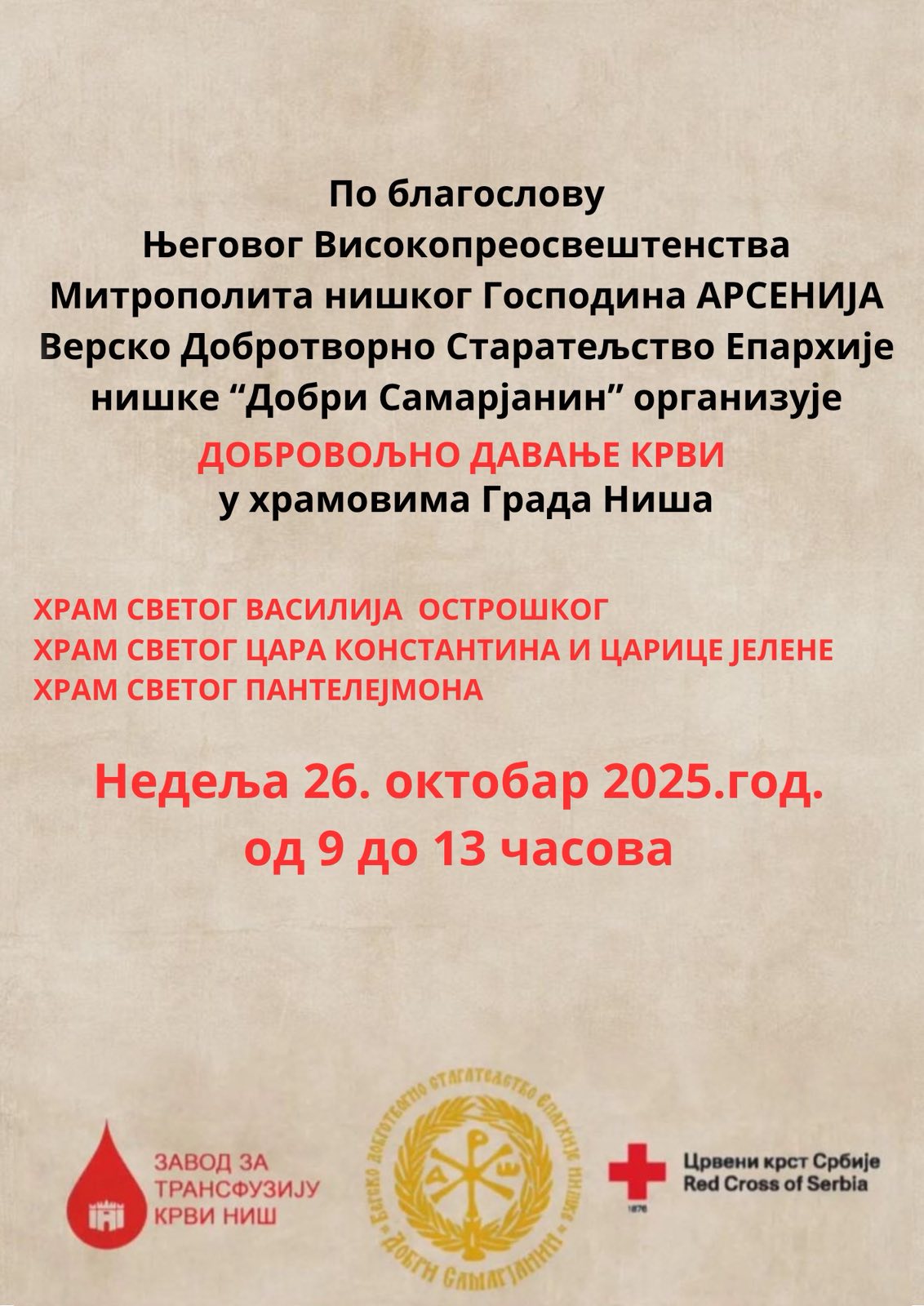 Versko dobrotvorno starateljstvo Eparhije niške „Dobri Samarjanin”, po blagoslovu mitropolita niškog Arsenija, organizuje akciju dobrovoljnog davanja krvi u nedelju, 26. oktobra, od 9 do 13 časova.