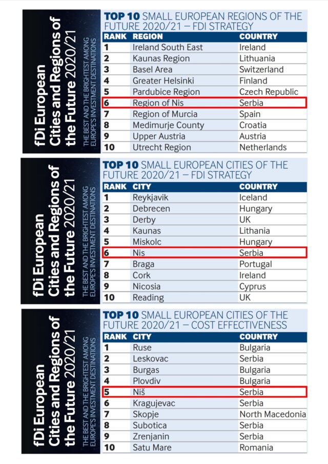 2018/19 Grad Niš je zauzeo sedmo mesto ,da bi ove godine na osnovu izveštaja prestižnog magazina otišao korak dalje i zvanično se našao na šestom mestu malih evropskih gradova budućnosti za 2020/2021.godinu kada je u pitanju strategija razvoja i na petom mestu po isplativosti za investiranje.