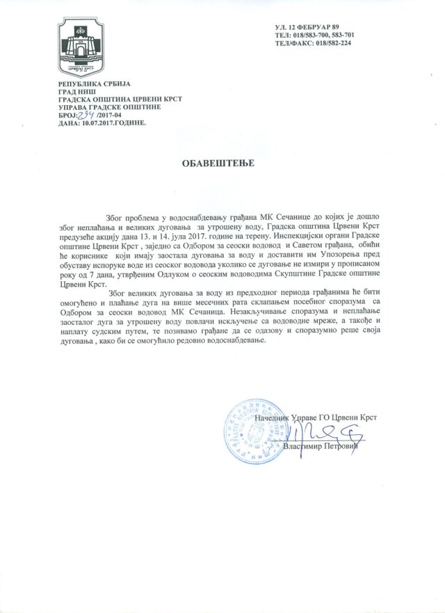Zbog problema u vodosnabdevanju građana MK Sečanice do kojih je došlo zbog neplaćanja i velikih dugovanja za utrošenu vodu, Gradska opština Crveni Krst preduzeće akciju dana 13. i 14. jula 2017. godine na terenu. Inspekcijski organi Gradske opštine Crveni Krst , zajedno sa Odborom za seoski vodovod i Savetom građana, obići će korisnike koji imaju zaostala dugovanja za vodu i dostaviti im Upozorenja pred obustavu isporuke vode iz seoskog vodovoda ukoliko se dugovanje ne izmiri u propisanom roku od 7 dana, utvrđenim Odlukom o seoskim vodovodima Skupštine Gradske opštine Crveni Krst.