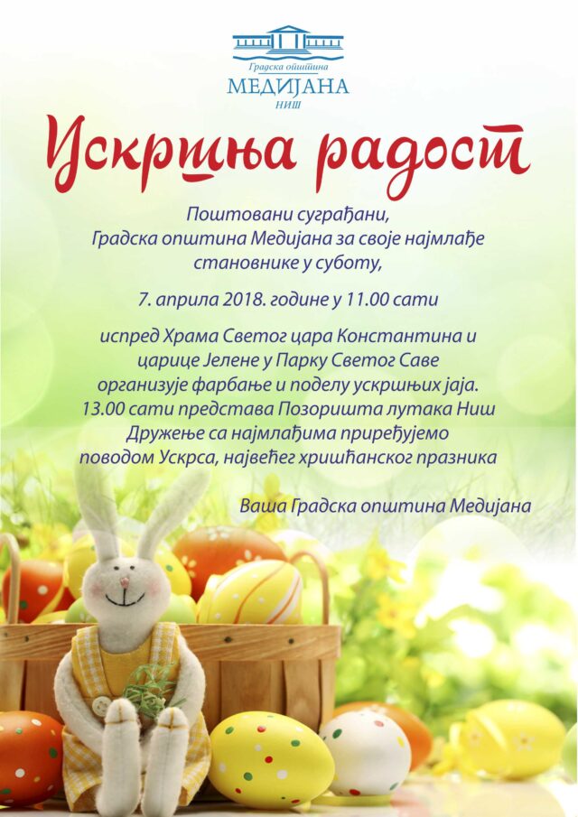 Gradska opština Medijana za svoje najmlađe stanovnike u subotu, 7. aprila 2018. godine u 11.00 sati ispred Hrama Svetog cara Konstantina i carice Jelene u Parku Svetog Save organizuje „Uskršnju radost“ – farbanje i podelu uskršnjih jaja i slatkih paketića najmlađima. U 13.00 sati na bini u parku biće izvedena predstava Pozorišta lutaka Niš .