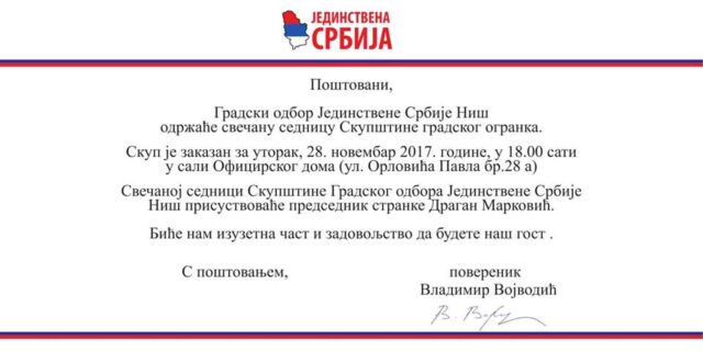 Gradski odbor Jedinstvene Srbije Niš održaće svečanu sednicu Skupštine gradskog ogranka. Skup je zakazan za utorak,28.novembra 2017.godine, u 18 sati u sali Oficirskog doma (ul.Orlovića Pavla br.28a). Svečanoj sednici Skupštine Gradskog odbora Jedinstvene Srbije Niš prisustvovaće predsednik stranke Dragan Marković Palma.