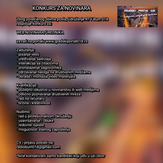 Naslovna Niš Gradski portal 018 raspisuje konkurs za radno mesto : WEB NOVINAR/UREDNIK Niš Gradski portal 018 raspisuje konkurs za radno mesto : WEB NOVINAR/UREDNIK Od redakcija GP018 - 02/06/2020 0 FacebookTwitterPinterestWhatsApp