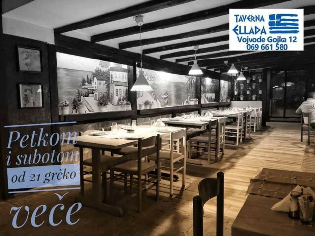 Doživite veče za pamćenje uživajte u Grčkoj hrani i u grčkim pićima u Taverni Ellada. Svakog petka i subote od 21h Grčkaka muzika uživo rezervišite vaše mesto na vreme. Taverna Ellada Vojvode Gojka 19 telefon za vaše rezervacije – 069 661 580. Tavena Ellada dobro došli