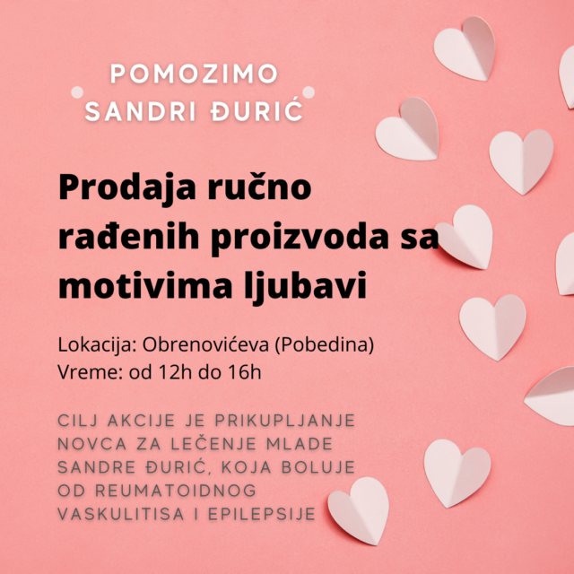 „Pozivamo sve građane koji su u mogućnosti da posete štand u subotu i doniraju novac za lečenje naše vršnjakinje! Naše malo njoj može značiti puno! Potrudili smo se da se na štandu nađu stvari za koje mislimo da bi se prolaznici zainteresovali da kupe, kao što su kolači, drveni privesci sa specifičnim natpisima, bukmarkeri iliti obeleživači za knjige, itd… Sav prikupljen novac ćemo uplatiti na žiro račun za Sandrino lečenje i nadamo se da će što više ljudi posetiti naš štand!“, poručuju koordinatori i članovi EXITO tima.