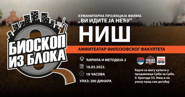 Obaveštavamo Vas, ujedno i pozivamo, na humanitarni bioskop u organizaciji humanitarne organizacije Srbi za Srbe i Saveza studenata Filozofskog fakulteta gde će na programu biti igrani film Vi idite, ja neću, koji će se prikazivati u sredu, 16. marta sa početkom od 18 časova u amfiteatru 21 Filozofskog fakulteta u Nišu.