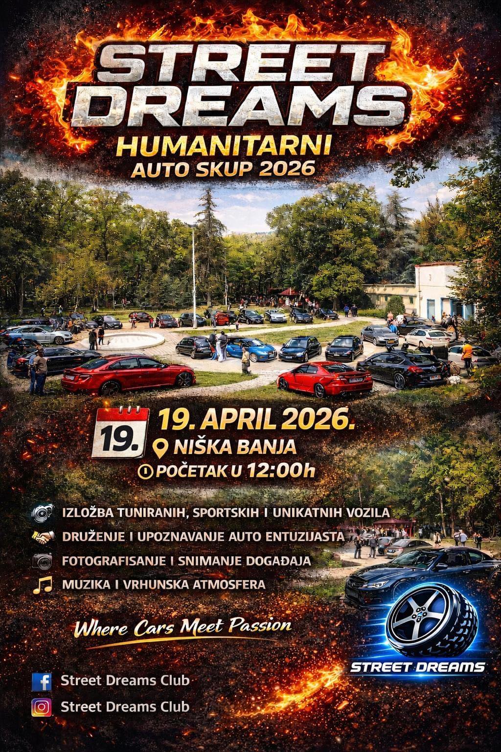 U Niškoj Banji će u nedelju, 19. aprila, sa početkom od 12 časova biti održan humanitarni auto skup „Street Dreams”, namenjen svim ljubiteljima automobila i dobre atmosfere.