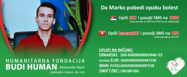 Novac za Markove lečenje može se donirati slanjem SMS poruke 817 na 3030, uplatom na dinarski račun: 160-6000000069946-22, uplatom na devizni račun 160600000006997338, IBAN: RS35160600000006997338, SWIFT/BIC: DBDBRSBG, uplatom platnim karticama putem linka: E-doniraj i uplatom sa PayPal naloga putem linka: PayPal.