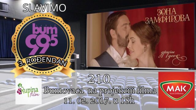 200 najsrećnijih slušalaca zahvaljujući industriji mesa MAK INTERNACIONAL imaće priliku da u subotu 11.02.2017 u 18 sati zajedno sa ekipom radija BUM pogledaju najnovije domaće filmsko ostvarenje, i da zajedno sa nama proslave treći rođendan.