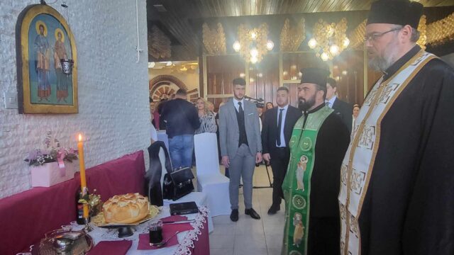 Obred sečenja slavskog kolača služio je protojerej Dejan Krstić, rektor Bogoslovije Svetog Kirila i Metodija u Nišu.
