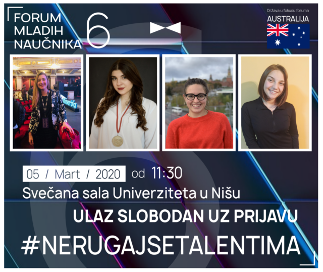 Isidoru Tasić, studentkinju Medicinskog fakulteta u Nišu, Emiliju Jovanović, studentkinju Biološkog fakulteta u Beogradu, Saru Milošević, učenicu Gimnazije u Inđiji i Jelenu Zdravković, učenicu ETŠ „Mija Stanimirović“ u Nišu povezuje jedna stvar, a to je ljubav prema nauci. Ove mlade i talentovane devojke, govornice su na ovogodišnjem šestom Forumu mladih naučnika, koji se održava 5. marta 2020. godine u Svečanoj Sali Univerziteta u Nišu.