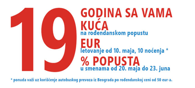 I ove godine, naši prijatelji iz Astra travela na sajmu predstavljaju lepote Sitonije, i povodom 19 godina postojanja, imaju specijalnu ponudu za vas. Letovanje u maju za samo 19 e  uz promotivnu cenu prevoza od 50 e po osobi. Iskoristite priliku i uživajte u čarima Sitonije.