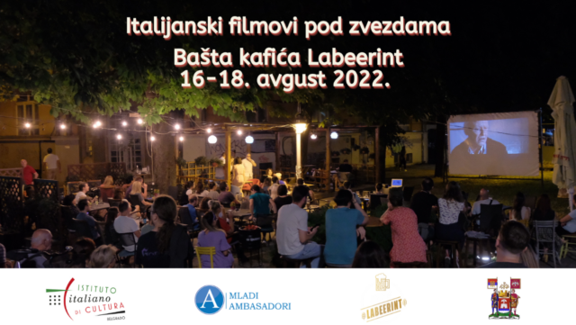Mladi ambasadori i Italijanski institut za kulturu vas pozivaju da ispratite ciklus filmova „Italijanski filmovi pod zvezdama“ koji će se održati od 16. do 18. avgusta od 21h u bašti kafića Labeerint u Nišu.