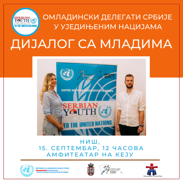 Udruženje za Ujedinjene nacije Srbije u saradnji sa Kancelarijom za mlade Grada Niša i Klubom za Ujedinjene nacije Pravnog fakulteta u sredu, 15. Septembra u 12.00 organizuje Dijalog mladih sa izabranim delegatima u Ujedinjenim nacijama. Dijalog će po prvi put biti održan na amfiteatru na keju, a sve sa idejom da što više mladih ljudi dobije priliku da pita delegate sve ono što ih zanima.