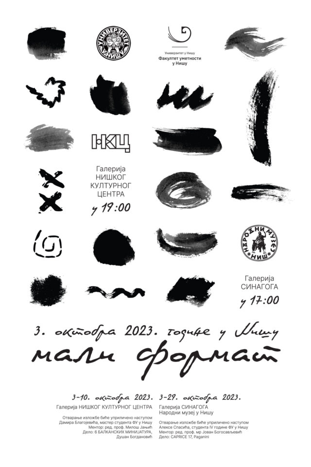 U okviru obeležavanja dana Fakulteta umetnosti u Nišu, Departman za likovne umetnosti zajedno sa Fakultetom i ove godine realizuje izložbu studentskih radova „Mali format“ sa ciljem uspostavljanja kontinuirane izlagačke prakse i saradnje sa fakultetima/Akademijama umetnosti, institucijama kulture, kolegama i studentima