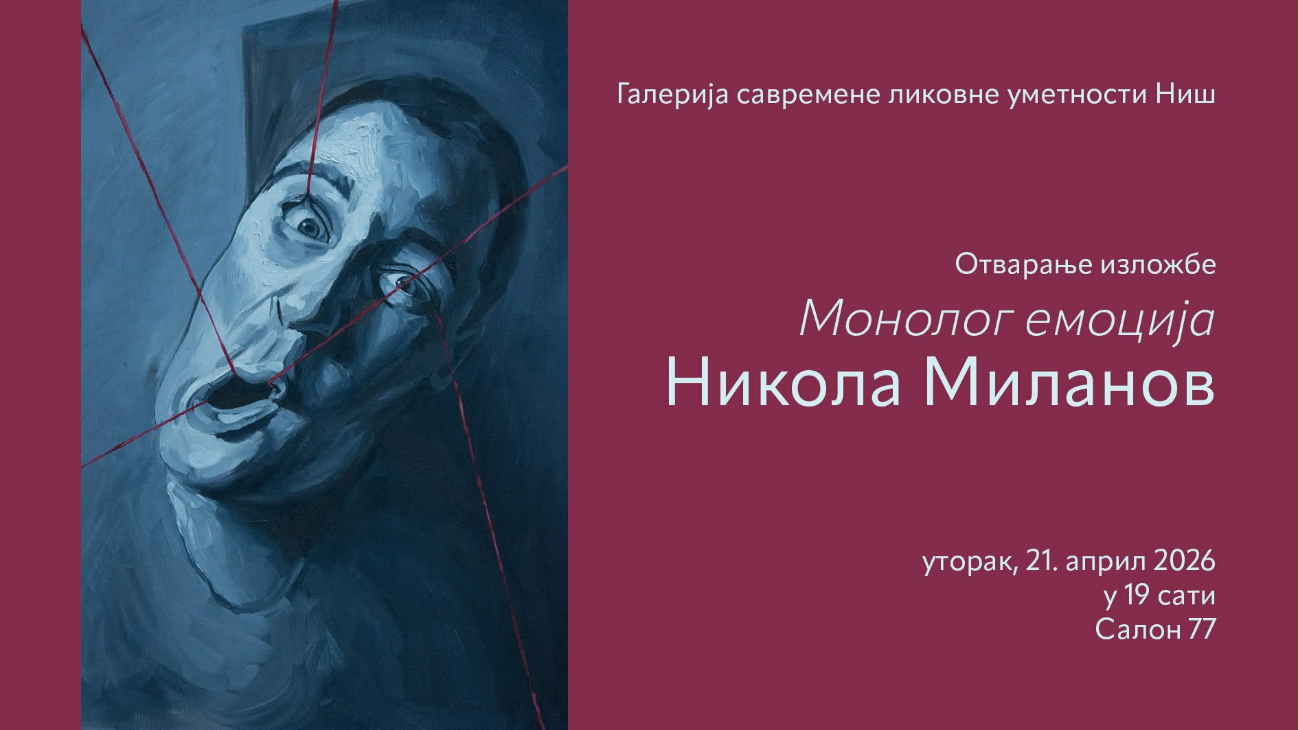 Izložba nosi naziv „Monolog emocija”, a kako ističu iz Galerije savremene likovne umetnosti, u njenom fokusu su portreti i autoportreti kroz koje umetnik istražuje psihološka stanja i emocionalne reakcije savremenog čoveka.