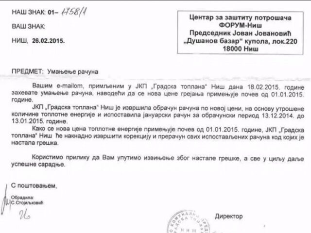 Januarski, pogrešno obračunati računi za grejanje biće korigovani i preračunati, odluka je gradske Toplane. Naime, do greške u računima je došlo jer se viša cena grejanja primenjuje od 1.januara, a račun za ovaj mesec obuhvata veći broj dana u decembru. Obzirom da utrošak toplotne energije nije očitan prvog dana ove godine, znaci da je i decembarska potrošnja računata po novoj ceni. Grešku je primetio centar za zaštitu potrošača Forum i odmah reagovao. Toplana se zbog nastale greške izvinjava potrošačima.