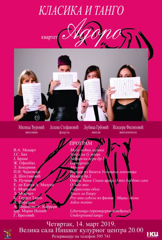 Koncert kvarteta Adoro „Klasika i Tango” u velikoj sali Niškog kulturnog centra, četvrtak 14. mart 2019. od 20 sati. Cena ulaznica 300 dinara, sa popustom za studente i penzionere 200 dinara.