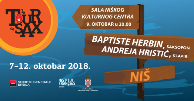 9. oktobra 2018 u 20h u okviru festivala “Le Tour de Sax” održaće se concert u Sali Niškog kulturnog centra u Nišu. Ovaj festival je nezaobilazna manifestacija za sve ljubitelje muzike kojima je kvalitet na prvom mestu. Dođite da propratite ovaj koncert i da uživamo svi zajedno u zvucima #saksofona ?u svim svojim vidovima (klasična muzika, džez…) Zahvaljujući partnerstvu sa bankom Societe Generale Srbija, turneja le Tour de Sax stiže i ove godine u Niš zajedno sa Andrejem Hristićem na klaviru i francuskim saksofonistom Batistom Erbenom, zaljubljenikom u Srbiju. Ulaz slobodan! *** Batist Erben Lepota zvuka njegovog saksofona je verovatno prvi kvalitet koji čujete pored neverovatne okretnosti i tehničkog umeća, njegovo sviranje osvaja i predstavlja jedan nesumnjivi talenat” Žan-Pier Žekson, Klasika, novembar, 2012.