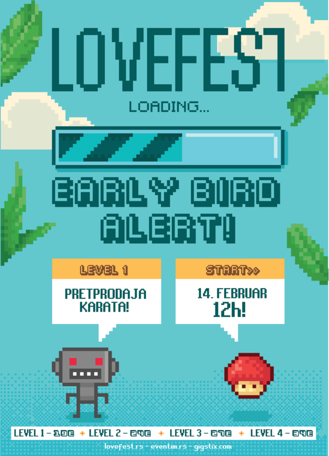 Pod sloganom “Next level” organizatori festivala najavili su početak prodaje prvih kompleta karata za 14. februar tačno u podne. Broj ulaznica je deo ograničene early bird serije namenjene samo za one najvatrenije i najbrže fanove, a trodnevna karta u pretprodajnoj fazi biće dostupna po ceni od 19 EUR. Prvi kupci će tako uštedeti do 45%, a ulaznice će moći da se kupe u svim poslovnicama Eventima i Gigstixa ili poruče putem sajta lovefest.rs.