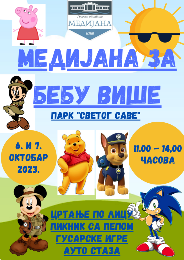 U okviru obeležavanja Dečije nedelje, Gradska opština Medijana, u petak i subotu, 06. i 07.oktobra 2023.godine, od 11 do 14 sati, organizuje tradicionalnu manifestaciju „Medijana za bebu više“.