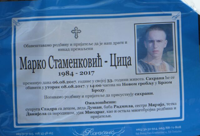 Marko Stamenković je juče sahranjen na groblju u Brzom Brodu. Na mestu njegove pogibije ostavljen je buket sa cvećem i smrtovnica.