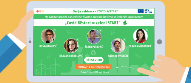 EU info mreža u Srbiji  pokrenula je novi serijal vebinara – COVID Restart, na kojima će se razgovarati o oporavku nakon pandemije. Prvi vebinar „COVID REstart = Zeleni start“ održaće se u petak, 5. juna od 18 sati, na Međunarodni dan zaštite životne sredine.