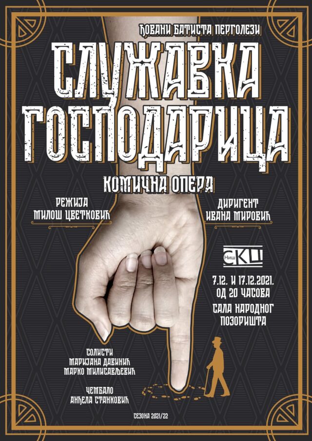 Nišlijke i Nišlije koji su ljubitelji opere imaće prilike da gledaju svetski poznatu komičnu operu „Služavka gospodarica“. Solisti Marijana Davinić i Marko Milisavljević, uz podršku Anđele Stanković na čembalu i kamernog orkestra predvođeni dirigentom mr Ivanom Mirović, oživeće na sceni ovaj biser napolitanskog baroka.