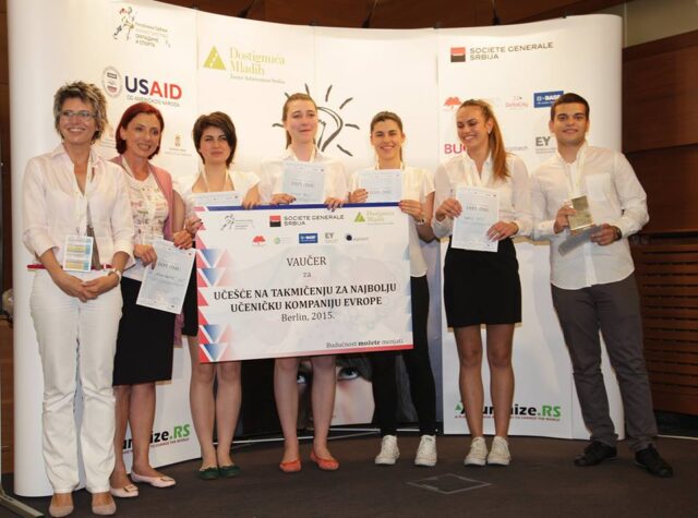 Nagradu je uručila Ivana Koprivica, Societe Generale Srbija . Čestitamo učenicima Aleksandru, Mili, Mariji, Isidori, Brankici i nastavnici Ani Veljković i zahvaljujemo se svim sponzorima Nacionalnog takmičenja učeničkih kompanija!