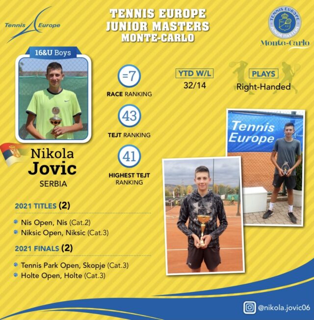 Teniser Teniske akademije Živković (TAŽ) iz Niša Nikola Jović je nakon sjajnih partija izborio plasman na završni juniorski masters koji će se igrati u Monte Karlu od 13. do 15. oktobra. Nikola će igrati u kategoriji do 16 godina i biće jedini predstavnik Srbije u toj kategoriji. Masters će okupiti osam najboljih tenisera nakon višemesečnih turnira iz serije TENNIS EUROPE. Teniser niške akademije je “tenisku trku” završio kao sedmi, nakon 32 pobede, dve šampionske i dve vicešampionske titule u prethodnih nekoliko meseci. Prvi teniser Srbije sa zvanične rangl liste je tako izborio priliku da igra u poznatom teniskom centru.