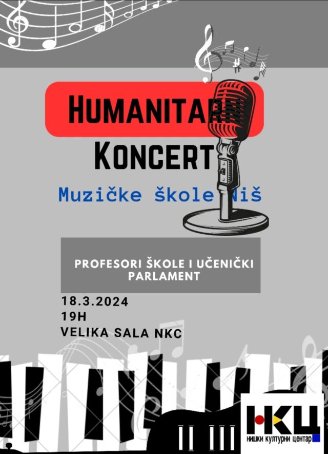 Niški kulturni centar zajedno sa Muzičkom školom u Nišu, organizuje humanitarni koncert, u ponedeljak 18. marta 2024, u Velikoj sali NKC-a, sa početkom u 19 sati.