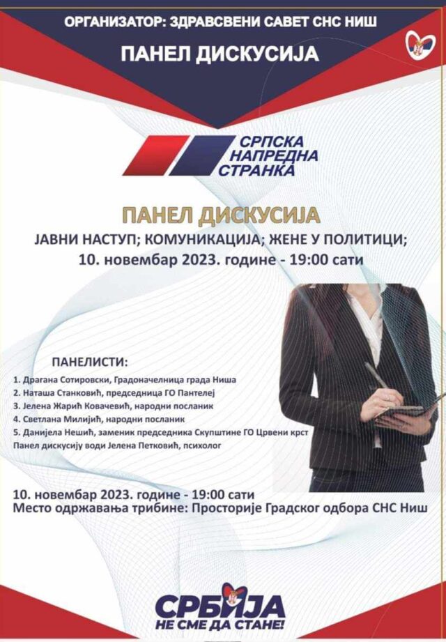 Zdravstveni savet SNS-a Niš organizuje tribinu pod nazivom „Javni nastup, komunikacija i žene u politici“, koja će biti održana sutra.