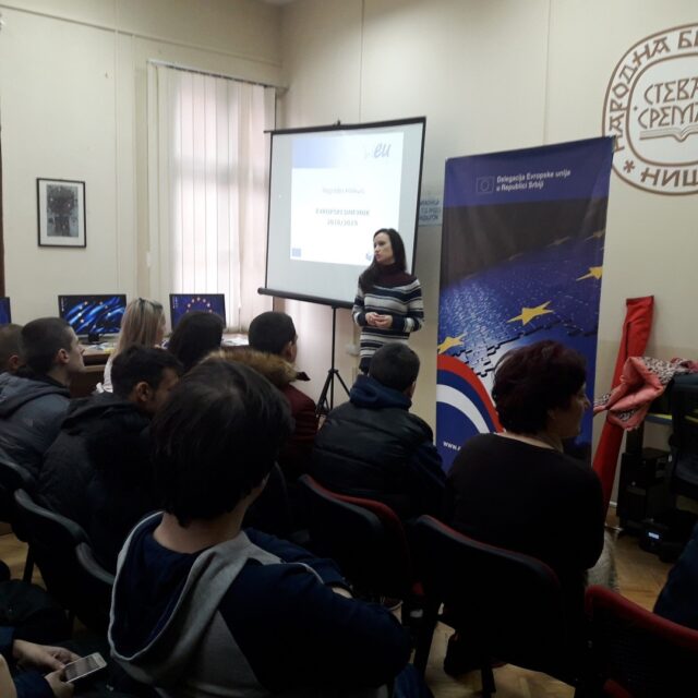 Snežana Andrić iz niškog EU info kutka govorila je o temama, kategorijama, ulozi mentora, nagradi, načinu podnošenja radova kao i o drugim pojedinostima u vezi sa konkursom koje su zanimale srednjoškolce i njihove profesore.