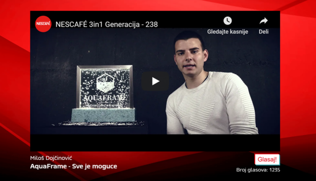 Nišlija Miloš Dojčinović jedan je od mladih preduzetnika koji je u trci za jednu od 10 nagrada na ovogodišnjem konkursu Nescafea „3u1 generacija“.  Miloš ima 23 godin i na konkurs se prijavio sa svojim proizvodom pod imenom Aquaframe. Aquaframe je profil popunjen vodom sa mehurićima, gravurom i led rasvetom čija je glavna namena ulepšavanje enterijera.