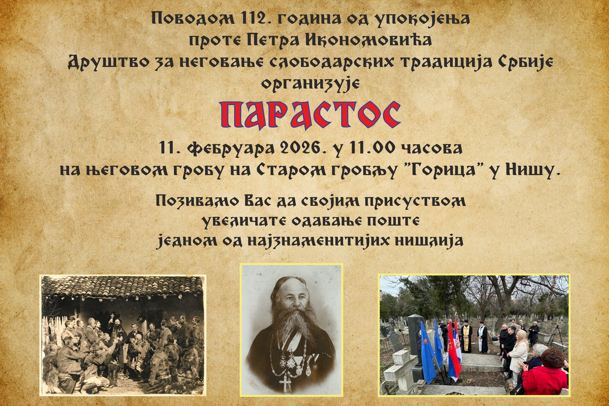 Društvo za negovanje slobodarskih tradicija Srbije iz Niša organizuje parastos proti Petru Ikonomoviću, jednom od osnivača Niškog komiteta. Parastos će biti služen u sredu, 11. februara 2026. godine, sa početkom u 11 časova, na njegovom grobu na Starom groblju „Gorica“ u Nišu.