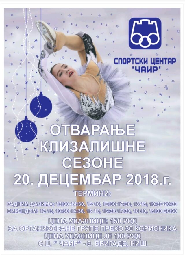 Otvaranje nove klizališne sezone u Sportskom centru „Čair“ zakazano je za 20. decembar 2018. godine. Smene su radnim danima od 13:00 do 20:30 i vikendom od 12:00 do 20:30, a cena ulaznice je 150 dinara. Neka vam ovi zimski dani proteknu u bavljenju sportom i lepom raspoloženju, dobrodošli.