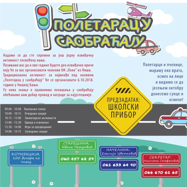 Tradicionalna aktivnost namenjena poletarcima i pčelicama održaće se u Niškoj Banji u subotu 6. oktobra 2018. godine, a imaćemo i goste iz Bele Palanke. Predzadatak za svaku ekipu obuhvata donošenje školskog pribora – sveske, olovke, gumice, bojica, flomastera. Po otvaranju akcije počinje nadmetanje u disciplinama vezanim za osnovna pravila u saobraćaju, prepoznavanju putnih znakova i boja na semaforu, pravljenju automobila od kartona, a zatim i njihova trka.