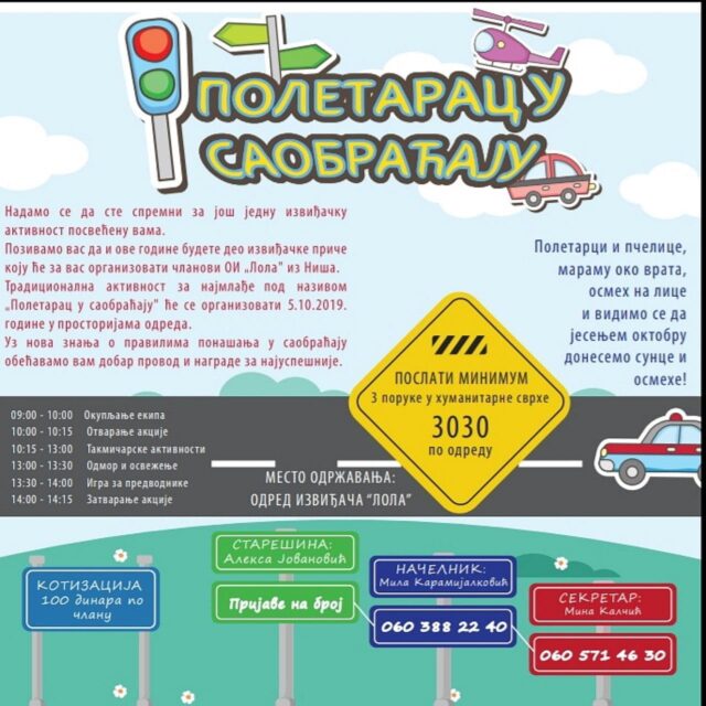 Odred izviđača „Lola“ za svoje najmlađe članove i njihove drugare iz drugih odreda organizuje akciju „Poletarac u saobraćaju“. Akcija će se održati 5. oktobra i biće smeštena na Panteleju. Okupljanje učesnika je u dvorištu „Lole“ u subotu u 9 sati.