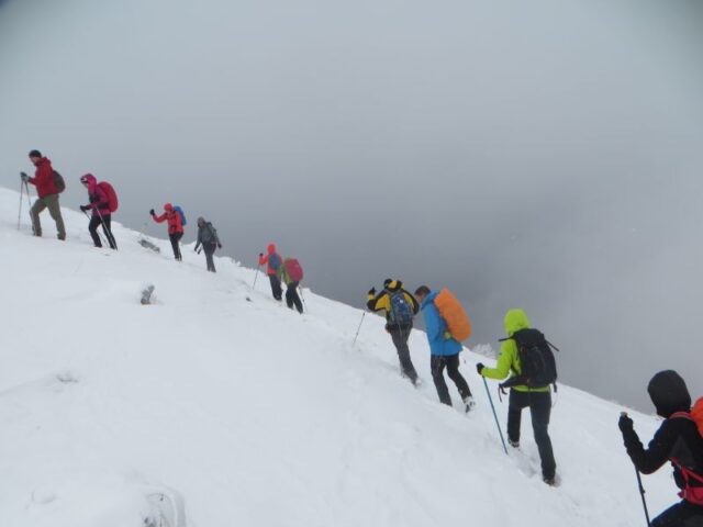 Uspon je izveden iz pravca skijaškog centra Babin do. Ka vrrhu Bjelašnice, učesnici su se kretali najpre kroz šumu, a kasnije i čistinom i prema grebenu. Ovde je već duvao veoma snažan vetar. Ogromna zgrada meteorološke stanice na vrhu Bjelašnice, nije se videla maltene dok planinari nisu izašli na par metara do nje. Na vrhu, izmereno je minus osamnaest stepeni, a vetar je duvao brzinom od 40 kilometara na sat. Vreme na Bjelašnici može biti i znatno nepovolnije, ali i ovakvi uslovi poprilično su izmorili planinare.